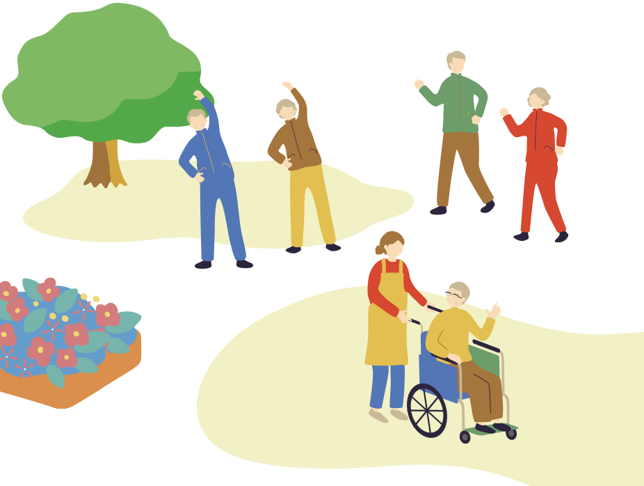 | 楽しく過ごす・交流する・入浴・食事 | 主な目的 | リハビリ・運動・日常生活訓練 | |||||||